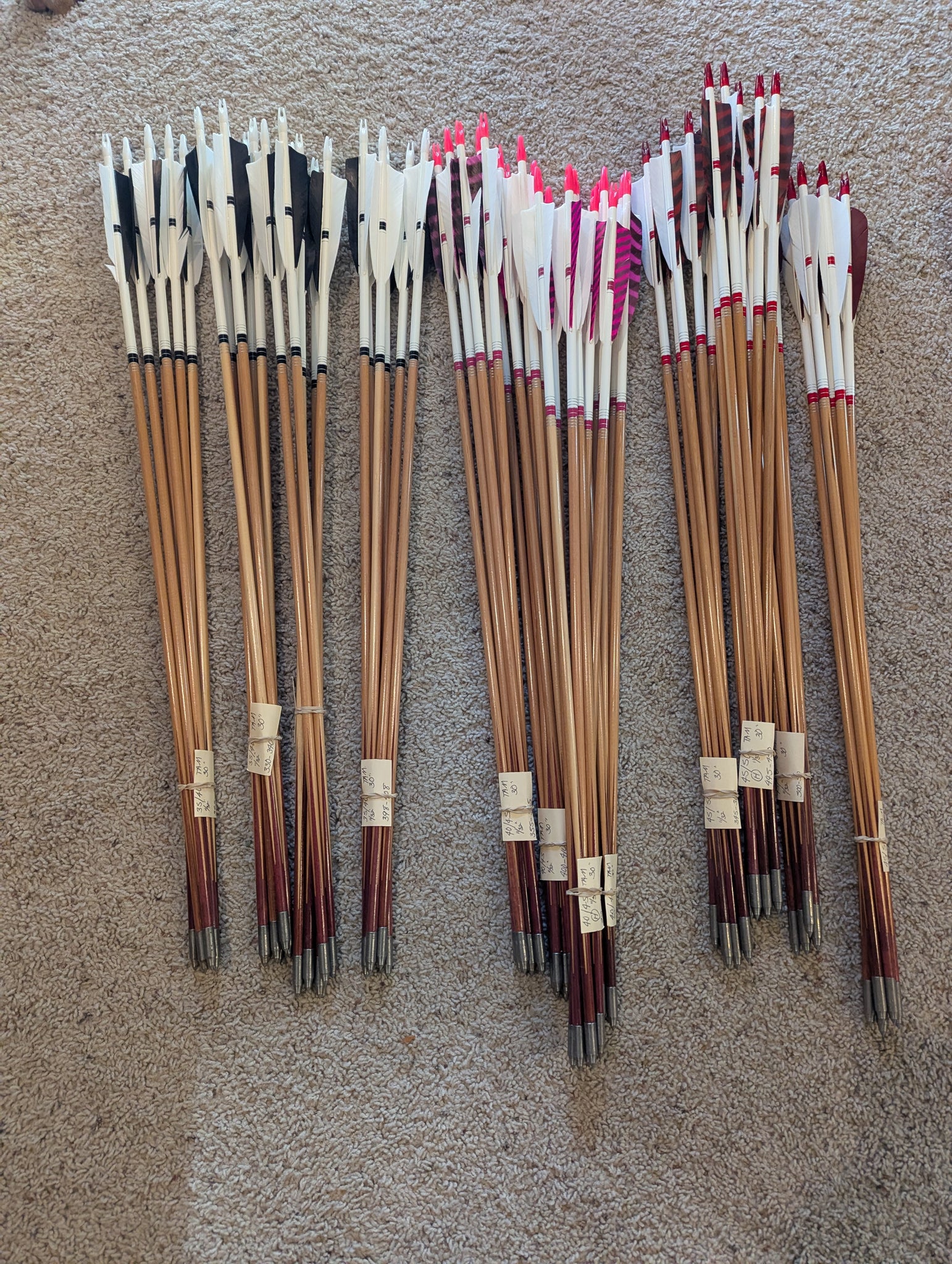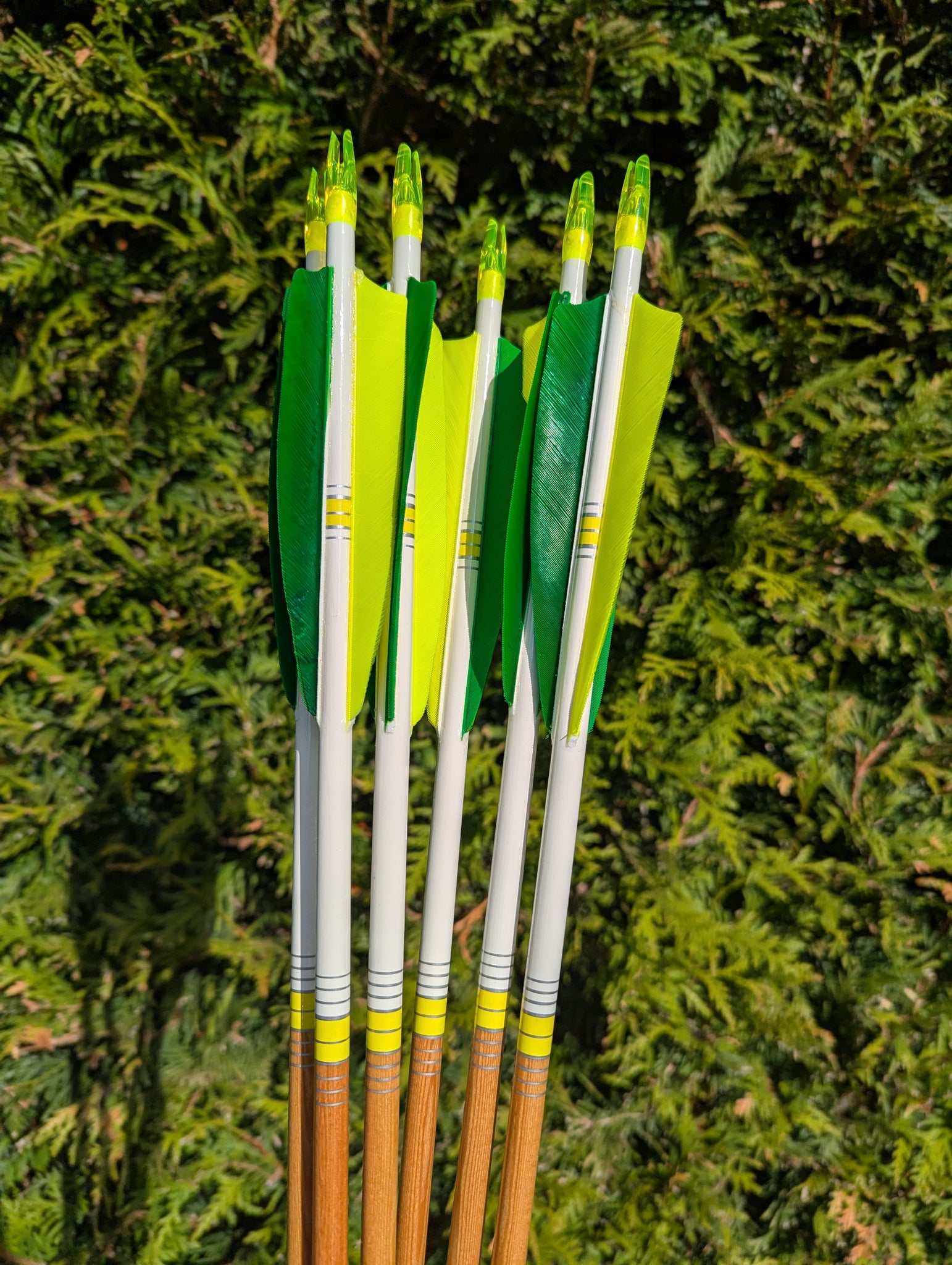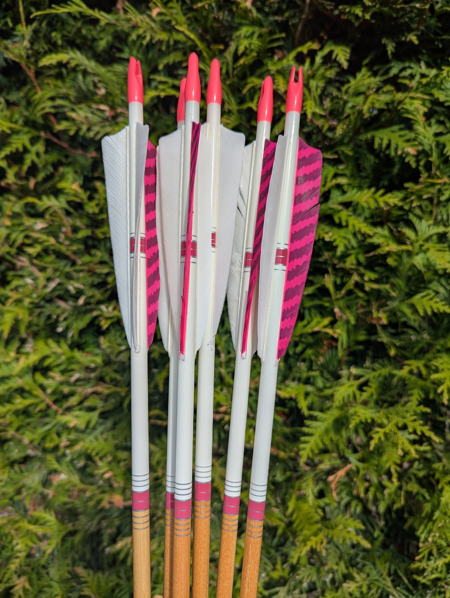 30" completed footed arrows (29 inch back of point) made with tamarack (larch) shafts and footed with purple heart. Each set is matched within 5 pounds spine and weight matched within 20 grains. The last 9 inches of the arrow are "tail tapered" down to 5/16". Arrows come with 125 grain points mounted on them. Each order comes with 6 arrows. All arrows have a double-dip clear coat, a white crown dip and three 5" feathers (some are shield and some are parabolic). These arrows will get good consistent flight when matched to the individual's bow set up. The following list show which colors come with each spine. The arrows are already made and will be shipped the next day, so no color substitutes please.